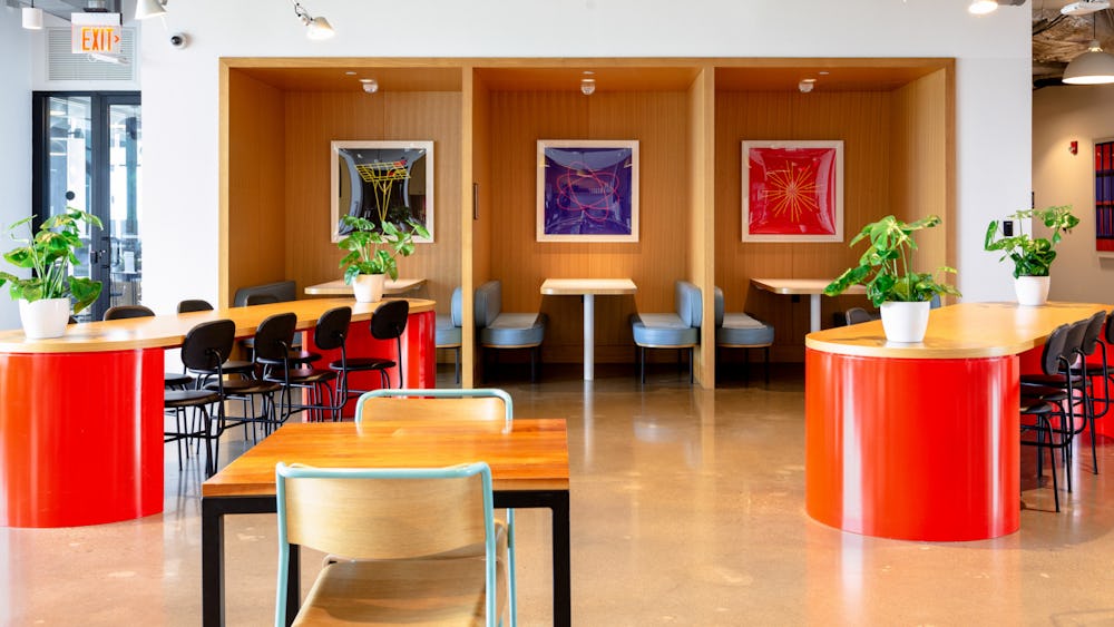 Their interior design encourages creativity with bright colors, open layouts, and comfortable seating arrangements.